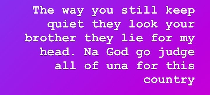 Her words: โWatin make you keep quiet for 20 years? @iamkingrudy. The way you still keep quiet they look your brother they lie for my head. Na God go judge