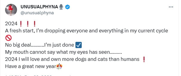 “No big deal. I’m just done. My mouth cannot say what my eyes has seen. 2024, I will love and own more dogs and cats than humans! Have a great new year.”