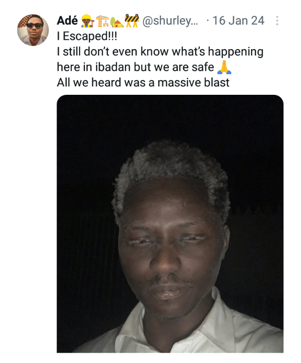 Ade, a survivor of the explosion that rocked the Bodija area of Ibadan, Oyo State, on Tuesday, January 16, has shared his near-death experience.