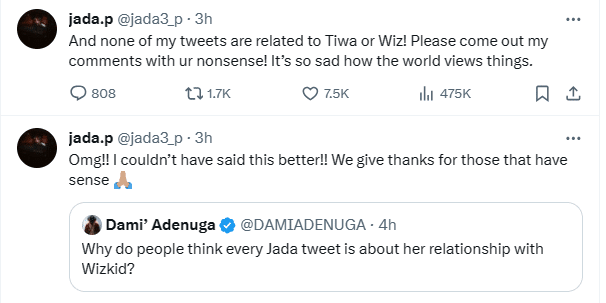 One Twitter user, @DAMIADENUGA wrote: “Why do people think every Jada tweet is about her relationship with Wizkid?”